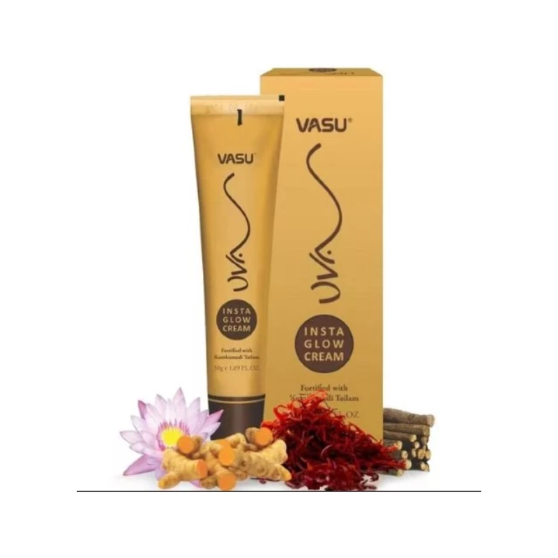 Vasu UVA Insta Glow cream brings the benefits of Kumkumadi Tailam in a specially formulated non-greasy base and pleasant fragrance, for a holistic skin care.
