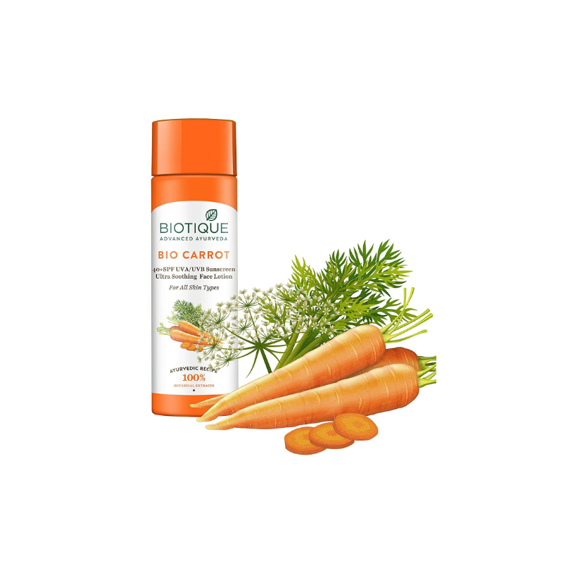 LA CAROTTE est riche en carotène, un produit chimique qui se transforme en vitamine A, crédité de nombreuses propriétés curatives et saines. Cette lotion riche en nutriments est mélangée à des extraits de feuille de Nyctanthes, de racine de carotte, d'écorce de Lodhra et de germe de blé germé pour garder la peau douce, claire et hydratée au soleil. Contient également de l'oxyde de zinc d'origine naturelle. Protège la peau avec un écran solaire SPF 40 UVA/UVB à large spectre