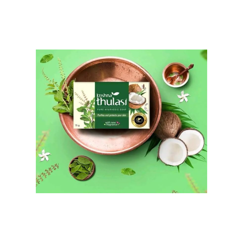 Le savon Krishna Thulasi est un savon ayurvédique pur, enrichi au Thulasi (basilic sacré) et à l’huile de noix de coco, conçu pour nettoyer, purifier et protéger la peau. Il possède des propriétés antibactériennes et antifongiques, aide à réduire les imperfections et hydrate en profondeur, laissant la peau douce, souple et saine. Convient à tous les types de peau, y compris les peaux sensibles.